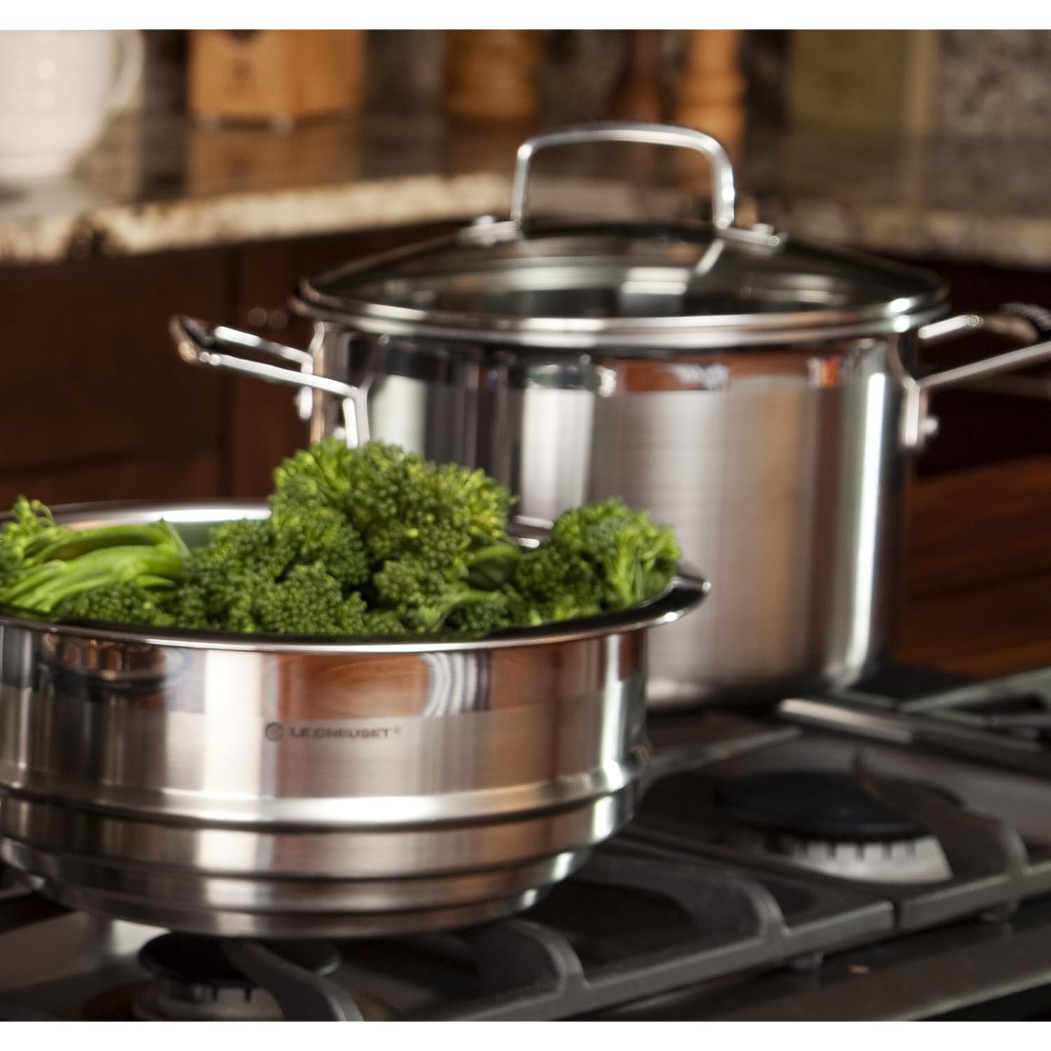 - Includes 3-Quart Casserole with lid and Steamer insert with lid